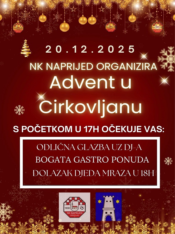 Već tradicionalno, mještani Cirkovljana okupit će se i ovoga Adventa, na tradicionalnom događanju „Advent u Cirkovljanu“. U centru Cirkovljana, na Trgu sv. Lovre, odlično druženje sve posjetitelje očekuje od 17 sati. Organizator, Nogometni klub Naprijed iz Cirkvoljana, pripremio je bogatu gastronomsku ponudu, odličnu glazbu uz DJ – a, a od 18 sati očekuje se i dolazak Djeda Mraza. Ne propustite priliku za odlično druženje ove subote u Cirkovljanu.