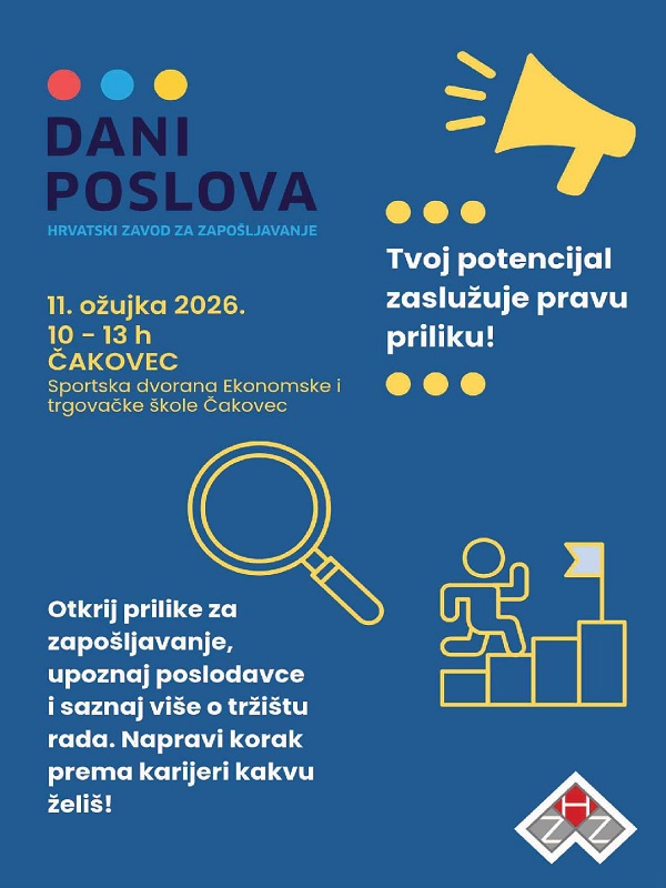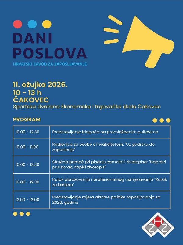 U sklopu ovih događanja, Hrvatski zavod za zapošljavanje Područni ured Čakovec, organizira Dane poslova u Čakovcu, u srijedu 11. ožujka, u Sportskoj dvorani Ekonomske i trgovačke škole Čakovec u vremenu od 10 do 13 sati. Od 10 do 12.30 sati održavat će se predstavljanje sudionika na promidžbenim pultovima. U deset sati započinje i radionica za osobe s invaliditetom „Uz podršku do zaposlenja“, biti će organizirana stručna pomoć pri pisanju zamolbi i životopisa pod nazivom „Napravi prvi korak, napiši životopis“ te poseban kutak obrazovanja i profesionalnog usmjeravanja „Kutak za karijeru“. Od 12 do 13 sati predstavit će se i mjere aktivne politike zapošljavanja za 2026. godinu.