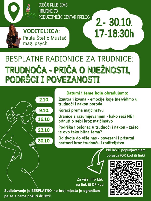 Dječji klub SIMS organizira besplatne radionice za trudnice pod nazivom: „Trudnoća – priča o nježnosti, podršci i povezanosti“.