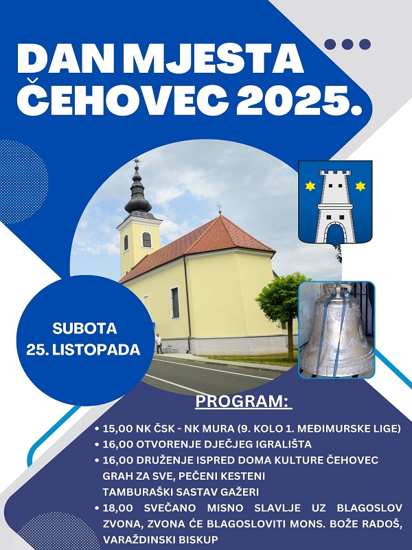Ove godine, u organizaciji Mjesnog odbora Čehovec, Dan mjesta Čehovec obilježit će se u subotnjim večernjim satima, 25. listopada. Od 18 sati, svečano misno slavlje u Kapeli sv. Roka u Čehovcu, će predvoditi varaždinski biskup, monsinjor Bože Radoš, uz domaćeg župnika, velečasnog dr. sc. Silvia Košćaka. a tijekom svete mise blagoslovit će se novo zvono Kapele sv. Roka. Zvono sv. Benedikta je izliveno u glasovitoj talijanskoj radionici De Poli, koja djeluje još od 1453. godine, a ovo je njihovo prvo zvono u Međimurju.