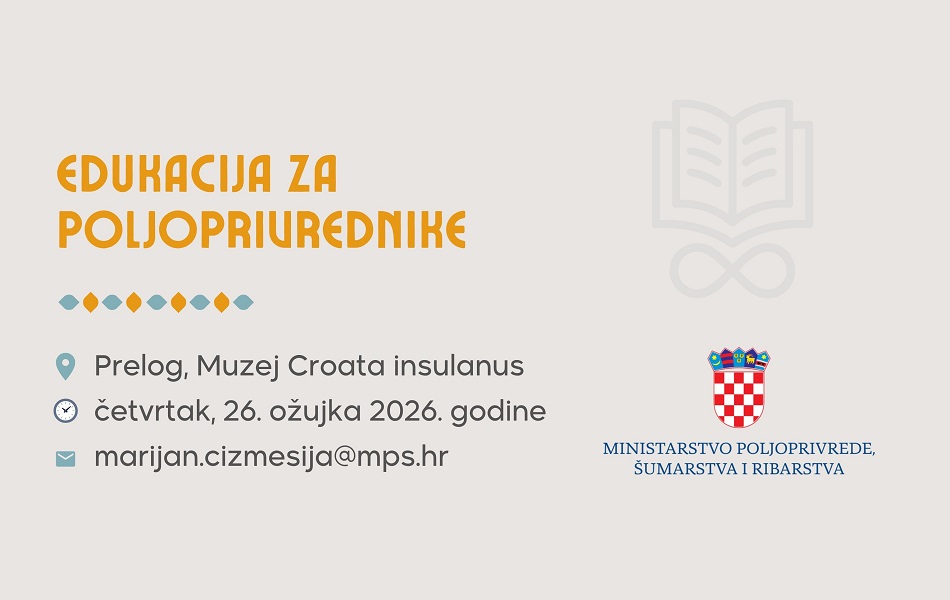 Edukacija će se održati u četvrtak, 26. ožujka 2026. godine, s početkom u 9 sati u Prelogu (Multimedijalna dvorana Muzeja Croata insulanus Grada Preloga, Glavna 33, Prelog). Na edukacijama će se svi zainteresirani moći upoznati i sa izmjenama Pravilnika i načinu podnošenja jedinstvenog zahtjeva za potpore u poljoprivredi za 2026. godinu. Mole se svi zainteresirani da se prijave mailom na marijan.cizmesija@mps.hr te jave potvrdu sudjelovanja, do ponedjeljka 23. ožujka 2026. godine, radi prijave i ograničenog broja mjesta.
