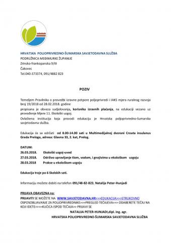 Hrvatska poljoprivredno-šumarska savjetodavna služba, Podružnica Međimurske županije, za sve obveznike kao i za sve zainteresirane poljoprivrednike organizira edukativne seminare. Temeljem Pravilnika o provedbi izravne potpore poljoprivredi i IAKS mjera ruralnog razvoja broj 19/2018 od 28.02.2018. godine propisana je obveza sudjelovanja, korisnika izravnih plaćanja, na edukaciji vezano uz provođenje Mjere 11. Ekološki uzgoj. Također, istim Pravilnikom propisana je obveza sudjelovanja, korisnika izravnih plaćanja, na edukaciji vezano uz provođenje Mjere 10. Poljoprivreda, okoliš i klimatske promjene. Ovlaštena institucija koja provodi edukaciju je Hrvatska poljoprivredno-šumarska savjetodavna služba. Edukacije će se održavati u terminima od 26. do 28. ožujka (Mjera M11) te od 3. do 5. travnja (Mjera M10.), od 8 do 14 sati, u prostoru Multimedijalne dvorane Muzeja Croata insulanus Grada Preloga. Sve informacije mogu se dobiti na telefon 091/4882-823, Natalija Peter-Hunjadi.