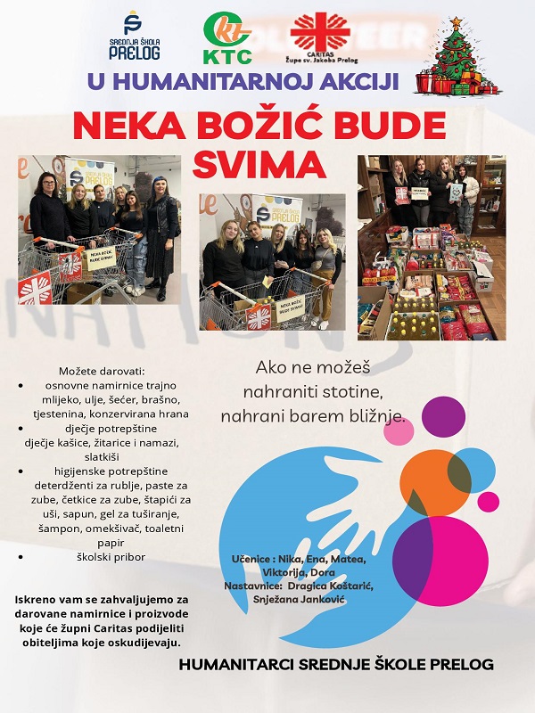 Tijekom akcije, učenici će, zajedno s nastavnicama Snježanom Janković i Dragicom Koštarić, sudjelovati u prikupljanju namirnica i potrepština na posebno označenom mjestu unutar trgovine. Preuzete donacije bit će proslijeđene Caritasu Župe Sv. Jakoba u Prelogu. Pozivaju se građani da prilikom kupovine izdvoje i doniraju trajne prehrambene proizvode i potrepštine kao što su: tjestenina, riža, brašno, šećer, ulje, konzerve i druge trajne namirnice, higijenske potrepštine, čokolade, keksi i druge slastice koje unose radost u blagdane. Ovom akcijom učenici SŠ Prelog uče o solidarnosti, empatiji i važnosti pomaganja drugima, osobito u vrijeme kada zajedništvo znači najviše. „Pozivamo sve građane da nam se pridruže i da zajedničkim snagama, učinimo da Božić bude svima!“, poručuju iz Srednje škole Prelog.