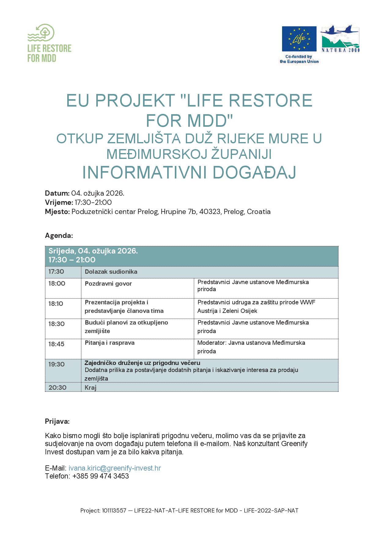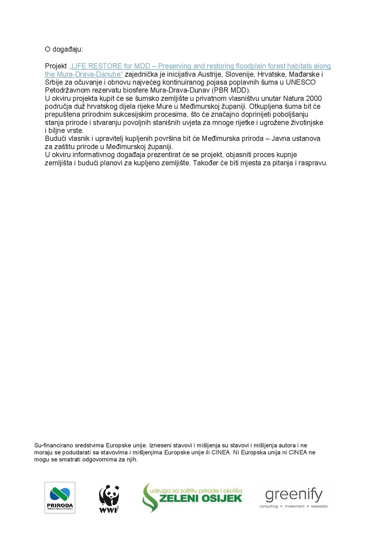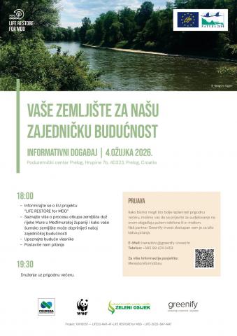 Međimurska priroda, javna ustanova za zaštitu prirode poziva na informativni događaj „OTKUP ZEMLJIŠTA DUŽ RIJEKE MURE U MEĐIMURSKOJ ŽUPANIJI“ u sklopu projekta „LIFE RESTORE for MDD“, koji će se održati 4. ožujka 2026. godine s početkom u 18:00 sati u Multimedijalnoj dvorani Poduzetničkog centra Prelog, na adresi Hrupine 7b, Prelog. Projekt „LIFE RESTORE for MDD – Preserving and restoring floodplain forest habitats along the Mura-Drava-Danube“ zajednička je inicijativa Austrije, Slovenije, Hrvatske, Mađarske i Srbije za očuvanje i obnovu najvećeg kontinuiranog pojasa poplavnih šuma u UNESCO-ovom petdržavnom Rezervatu biosfere Mura-Drava-Dunav (PBR MDD). U okviru projekta kupuje se šumsko zemljište u privatnom vlasništvu unutar Natura 2000 područja duž hrvatskog dijela rijeke Mure u Međimurskoj županiji. Otkupljena šuma bit će prepuštena prirodnim sukcesijskim procesima što će značajno doprinijeti poboljšanju stanja prirode i stvaranju povoljnih stanišnih uvjeta za mnoge rijetke i ugrožene životinjske i biljne vrste. Budući vlasnik i upravitelj kupljenih površina bit će Međimurska priroda – Javna ustanova za zaštitu prirode. U okviru događaja predstavit će se projekt, objasniti proces kupnje zemljišta i budući planovi za kupljeno zemljište. Nakon toga slijede pitanja i rasprava. U prilogu možte pronaći detaljan raspored događanja.