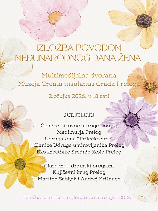 U Multimedijalnoj dvorani Muzeja Croata insulanus Grada Preloga, u ponedjeljak, 2. ožujka 2026. godine, u 18 sati, otvara se tradicionalna izložba likovnih i ručnih radova kreativnih žena povodom Međunarodnog dana žena. Izložba okuplja žene koje su slikarstvo, rukotvorine i umjetničko izražavanje učinile važnim dijelom svog života. Kroz njihove radove posjetitelji će moći doživjeti raznolikost stilova, boja i tehnika, ali i osjetiti snagu, predanost i ljubav koju žene utkaju u sve što stvaraju. Svoje umijeće stvaranja predstavit će članice Likovne udruge Donjeg Međimurja Prelog, članice kreativne radionice Udruge umirovljenika Prelog, članice Udruge žena „Priločko srce“ te eko kreativke Srednje škole Prelog. Otvorenje izložbe biti će obogaćeno prigodnim glazbeno dramskim programom u kojem sudjeluju Književni krug Prelog, Martina Sabljak i Andrej Križanec. Pozivaju se svi ljubitelji umjetnosti i kulture da se pridruže u proslavi stvaralaštva, zajedništva i doprinosa žena društvu. Izložba se može razgledati do 5. ožujka 2026. godine.