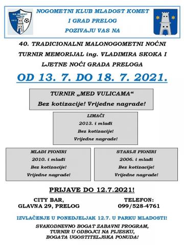 Zbog situacije oko nas, a vezano uz pandemiju koronavirusa, ove se godine turnir održava u skraćenom obliku. Igrat će se od utorka do nedjelje, od 13. do 18. srpnja. Nogometni dio turnira, ove će se godine igrati kroz kategoriju Med Vulicama i u mlađim dobnim kategorijama. Pozivaju se ekipe koje se žele prijaviti i dobro zabaviti da se prijave na broj telefona 099/528-4761. Uz turnir Med Vulicama, igrat će i limači (rođeni 2013. i mlađi), mlađi pioniri (rođeni 2010. i mlađi) i stariji pioniri (rođeni 2006. godine i mlađi). Kotizacija nema ni u jednoj kategoriji. U svakoj konkurenciji nagrađuju se najbolji golman, igrač i strijelac. Ekipe se mogu prijaviti svakodnevno do 12. srpnja u City baru u Prelogu ili na broj telefona 099/528-4761, gdje se mogu dobiti i sve potrebne informacije. Izvlačenje je predviđeno za ponedjeljak 12. srpnja, u Parku Mladosti u Prelogu.