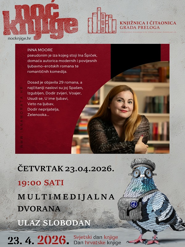 U sklopu manifestacije Noć knjige u goste, Knjižnici i čitaonici Grada Preloga, dolazi Inna Moore. Iza ovog književnog pseudonima stoji Ina Špiček, domaća autorica koja je osvojila brojne čitateljice i čitatelje svojim modernim i povijesnim ljubavno-erotskim romanima te romantičnim komedijama. Dosad je objavila čak 29 romana, a među njezinim najpoznatijim i najčitanijim naslovima ističu se Spašen, Izgubljen, Dodir zvijeri, Voajer, Usudi se, U ime ljubavi, Veto na ljubav, Dodir neprijatelja i Zelenooka.