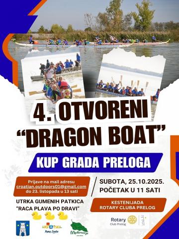 „Zmajski čamci“ već su dobro poznati ljuditeljima veslanja na području Preloga, a novi veslački spektakl, 4. Otvoreni „Dragon boat“ kup Grada Preloga, u organizaciji Turističke zajednice Grada Preloga, održat će se u subotu, 25. listopada, na vodi Jezera Hidroelektrane Dubrava. Ove će godine program biti dodatno obogaćen i Kestenijadom Rotary cluba Prelog, ali i posebnom atrakcijom, humanitarnom utrkom „Raca plava po Dravi“, koju zajedničkim snagama organiziraju Turistička zajednica Grada Preloga i Društvo sportske rekreacije Sportikus.
