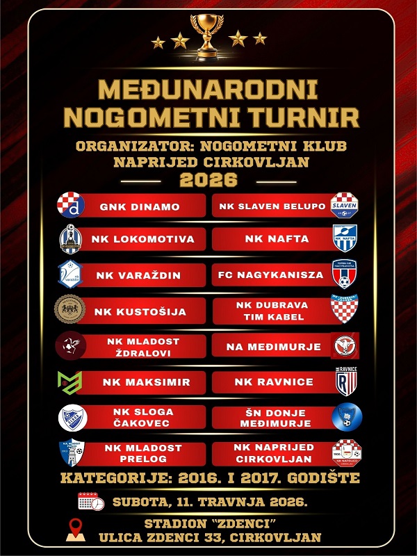 Nogometni klub Naprijed iz Cirkovljana posljednjih nekoliko je godina posebno ponosan na svoj rad sa mladim generacijama nogometaša. Kao dio tog sjajnog rada i ove će godine Nogometni klub Naprijed biti domaćin Međunarodnog nogometnog turnira, za 2016. i 2017. godište. Turnir će se održati u subotu 11. travnja u Sportskom parku Zdenci u Cirkovljanu. Svoj su dolazak potvrdili: GNK Dinamo Zagreb, NK Sloga Čakovec, NK Nafta Lendava, NK Varaždin, NK Slaven Belupo, NK Kustošija, NK Maksimir, NK Ravnice, NK Mladost Komet, Nogometna akademija Međimurje Čakovec, NK Lokomotiva Zagreb, NK Dubrava Tim kabel, Škola nogometa Donje Međimurje, Football Club Nagykanizsa, NK Trnava Goričan i NK Mladost Ždralovi, a predstavit će se i domaći nogometaši, igrači Nogometnog kluba Naprijed iz Cirkovljana.