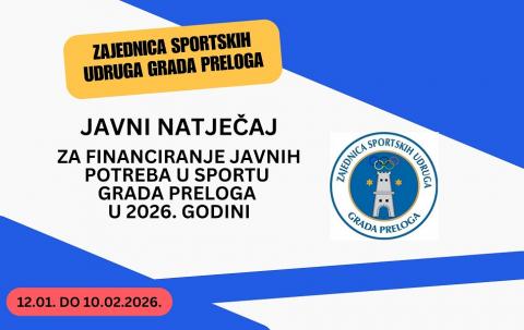 Zajednica sportskih udruga Grada Preloga raspisala je Javni natječaj za financiranje javnih potreba u sportu Grada Preloga u 2026. godini. Predmet ovog Javnog natječaja je prikupljanje pisanih prijedloga projekata organizacija civilnog društva koje djeluju na području Grada Preloga u slijedećim prioritetnim područjima: redovna sportska djelatnost sportskih klubova i udruga, sportske manifestacije, prijevoz sportaša na sportska natjecanja te najam dvorana za treninge i sportska natjecanja. Ukupna planirana vrijednost Javnog natječaja je 170.000,00 eura. Prilikom prijave projekta udruga se može javiti na svako od ponuđenih prioritetnih područja. Sve informacije potražite na sljedećoj poveznici: