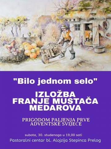 Uz paljenje prve adventske svijeće, u Pastoralnom centru „Bl. Alojzije Stepinac“, otvorit će se izložba pod nazivom „Bilo jednom selo“ Franje Mustača Medarova. U glazbenom programu sudjelovat će glazbenica Doris Karamatić na harfi. Otvorenje izložbe održat će se u subotu, 30. studenoga, s početkom u 19 sati.