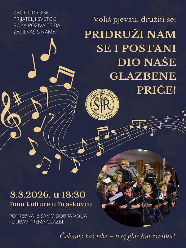 Mješoviti pjevački zbor udruge "Prijatelji svetog Roka" poziva sve zainteresirane ljubitelje glazbe i pjevanja da im se pridruže i postanu dio njihove glazbene priče. Prilika za to je u utorak, 3. ožujka od 18:30 sati u prostorijama Udruge u Domu kulture u Draškovcu. Dođite na druženje, pkažite svoje pjevačko znanje, a „Prijatelji svetog Roka“ poručuju: „Voliš pjevati, družiti se? Pridruži nam se i postani dio naše glazbene priče! Čekamo baš Tebe - Tvoj glas čini razliku!“.