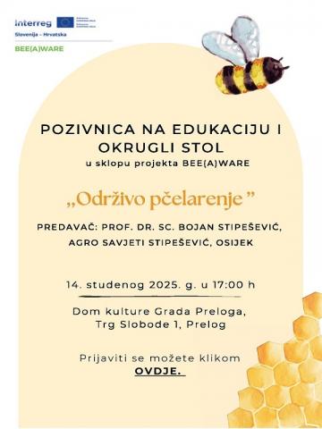 Javna ustanova REDEA poziva vas na drugo predavanje u okviru projekta BEE(A)WARE, sufinanciranog kroz Program Interreg Slovenija – Hrvatska. Predavanje će se održati u petak, 14. studenog 2025. godine, s početkom u 17:00 sati u dvorani Doma kulture Grada Preloga. Predavanje će održati prof. dr. sc. Bojan Stipešević na temu: „Održivo pčelarenje – „Važnost pčela medarica i ostalih oprašivača za visinu i kvalitetu uroda u ratarstvu i voćarstvu“.
