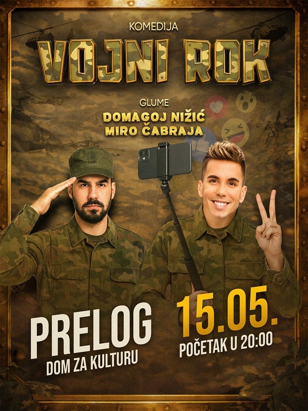 „Po prvi puta u Međimurju, nakon više od 200 rasprodanih dvorana! Što se događa kad u vojarnu umaršira generacija odrasla uz društvene mreže, naviknuta na jogu, proteine i detox sokove, a dočeka je vojna disciplina i hijerarhija? Odgovor na to pitanje daje HIT predstava 'VOJNI ROK' Mire Čabraje u kojoj igra i Domagoj Nižić. Ova izvedba RASPRODALA je SVE TERMINE u Zagrebu, a rekordno se pune i druge dvorane u cijeloj Hrvatskoj! Kombinacija aktualne teme, dobrog humora i dva potupuno različita lika je definitivno spoj koji oduševljava svu publiku, a prate je i milijunski pregledi na društvenim mrežama. Pridružite nam se na večeri humora i postanite ročnik s nama!“
