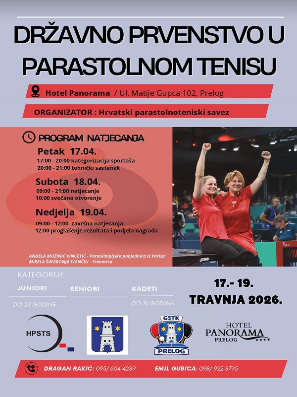 Od 17. do 19. travnja Prelog će biti domaćin Državnog prvenstva u parastolnom tenisu, jednog od najznačajnijih sportskih događanja za osobe s invaliditetom u Hrvatskoj. U organizaciji Hrvatskog parastolnoteniskog saveza, u grad stižu najbolji hrvatski parastolnotenisači, a natjecanja će se održavati u dvorani uz Hotel Panorama. Natjecanja će se održati u tri kategorije: kadeti, juniori i seniori, a samo svečano otvorenje natjecanja predviđeno je za subotu u 10 sati. Petak je rezerviran za prijave i kategorizaciju sportaša, a subota i nedjeljno prijepodne za samo natjecanje. U organizaciji natjecanju pomoći će i članovi Gradskog stolnoteniskog kluba Prelog. Hrvatski parastolnoteniski savez (HPSTS) nacionalni je sportski savez koji okuplja stolnoteniske klubove i saveze osoba s invaliditetom diljem Hrvatske. Osnovan je u kolovozu 2006. godine pod nazivom Hrvatski stolnoteniski savez osoba s invaliditetom. HPSTS je posvećen razvoju i promociji stolnog tenisa za osobe s invaliditetom u Hrvatskoj. Kroz organizaciju natjecanja, edukaciju i pružanje podrške klubovima, Savez nastoji omogućiti sportsku rekreaciju, rehabilitaciju i natjecateljske prilike za sve kategorije invaliditeta.