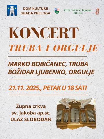 U organizaciji Doma kulture Grada Preloga, u Župnoj crkvi sv. Jakoba ap.st. u Prelogu, u petak 21. studenog 2025. godine, s početkom u 18 sati, održat će se koncert „Truba i orgulje“. Ulaz na koncert je slobodan, a zanimljiv duo orgulja i trube čine Marko Bobičanec (truba) i  Božidar Ljubenko  (orgulje). Orgulje u Crkvi sv. Jakoba ap.st. izgrađene su 1896. godine, a graditelj je bio Josef Angster, značajni europski graditelj orgulja, inače rođeni Baranjac (Jagodnjak), a koji je od 1867. imao vlastitu poznatu radionicu u Pečuhu. Zvuk orgulja upotpunit će zvuci trube te donijeti prekrasan glazbeni doživljaj u iznimnom ambijentu crkve u Prelogu.
