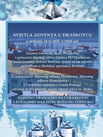 Adventskim programima na području Grada Preloga priključuje se i Draškovec. Tako će učenici Osnovne škole Draškovec i mališani iz Dječjeg vrtića Fijolica, Područnog odjeljenja Draškovec, tradicionalno donijeti Božićnu radost svom mjestu Božićnom priredbom u Sportskoj dvorani Osnovne škole Draškovec. U poslijepodnevnim satima, u organizaciji Mjesnog odbora Draškovec, Mjesnog odbora Hemuševec i Turističke zajednice Grada Preloga održava se blagdanski sajam na prostoru ispred Župne crkve sv. Roka u Draškovcu. „Zajedno obasjajmo naš Draškovec i pošaljimo najljepšu Božićnu čestitku“, poručuju organizatori.